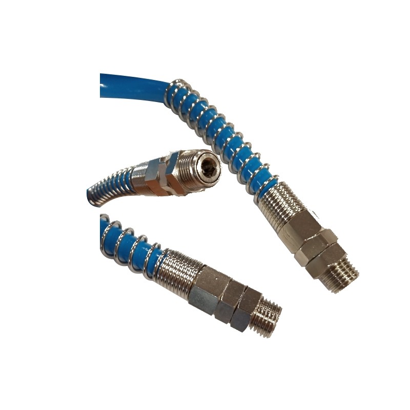 A POLIURETÁN spiráltömlők Shore A 98 anyagból készülnek. Lehetővé teszik a légnemű és folyékonyan áramló közegek gyors és hatékony átáramlását. A visszahúzóerő hatására nem marad a munkahelyen tömlőhalom. Nincs botlásveszély. A munkavégzés megszűnésével automatikusan visszaugrik eredeti helyzetébe. Rendkívül rugalmas alacsony hőmérsékleten is. Jó vibrációtűrés és öregedésállóság jellemzi.