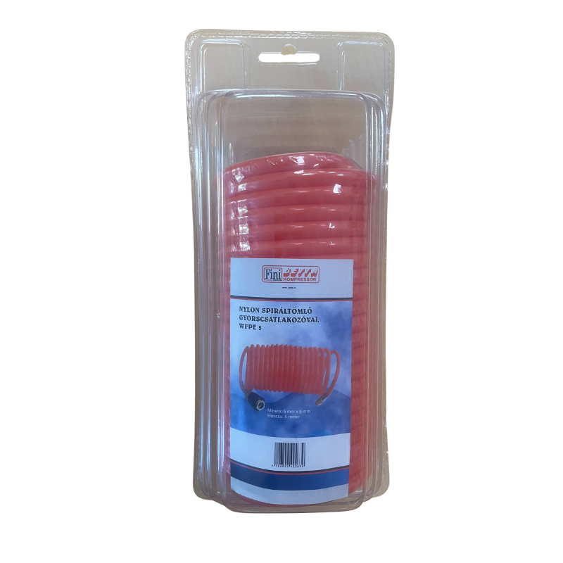 Nylon alapanyagú, narancssárga színű spiráltömlő, gyorscsatlakozóval szerelve. A tömlőn található gyorscsatlakozó és ellendarab megfelel az európai szabványnak.