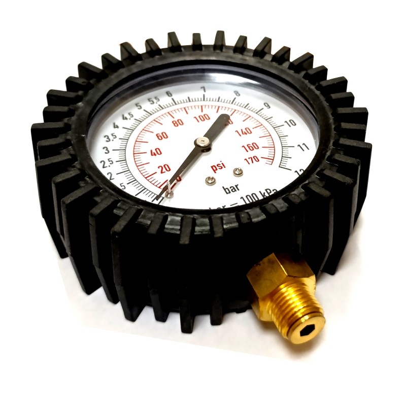 A TG-18 tömlőfúvatóhoz rendelhető manométer. A manométerhez gumi védőburkolat is tartozik, amely megvédi az órát az esetleges sérülésektől. Tizedes beosztású, alsó csatlakozással.